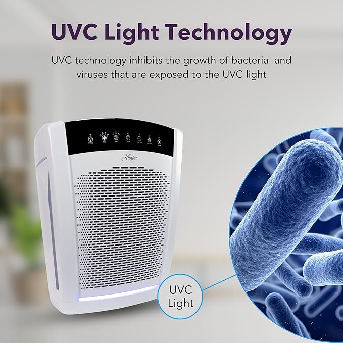 Hunter HP850 Air Purifiers for Home Large Room and Bedroom. True HEPA Air Purifier for Pets, Odors, Allergens, Smoke, Dust. 4 Fan Speeds, Quiet Sleep Mode, UV Mode. Filters 2585 Ft² per hour. White