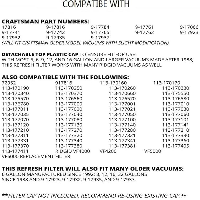 - Package & Diamension: Each package contains 2 pack 1-Layer Standard Wet/Dry Vac Filter Vf4000, fits for Ridgid 5-20 gallon vacuum cleaners, for HUSKY 6-9 gallon vacs and for CRAFTSMAN vacuums made after 1988. Compatible Part Number (P/N): For Ridgid VF4000