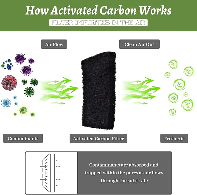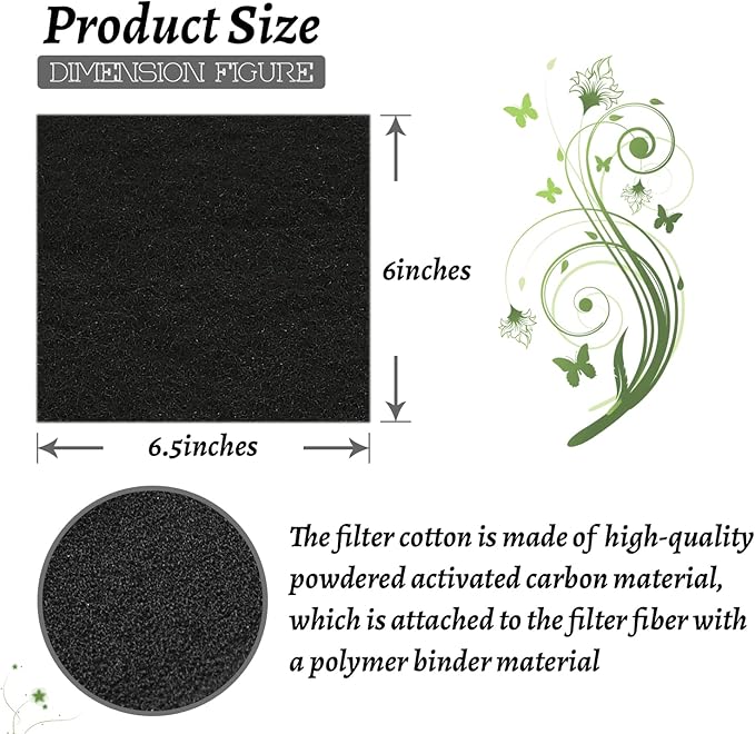 - Safe Material: These activated carbon filters (fibrous) are made of high-quality powdered activated carbon as the adsorption material, and the high-density polymer binding material is used to attach the carbon to the fiber. With the thickness of 1cm (0.4"), the filters can efficiently absorb odors.