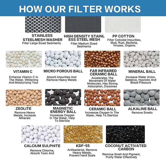 - More Efficient Water Softener Shower Head Filter: the new calcium sulfite dechlorination column and Coconut shell activated carbon are more rougher than spherical surfaces and also have a larger contact area with water, the shower water softener can achieve almost double removal effect of chlorine & impurities . It makes the shower filters to remove chlorine and heavy metals(iron, mercury, lead...).This water softener shower head will make bathing KIDS and PETS pleasant and SAFE