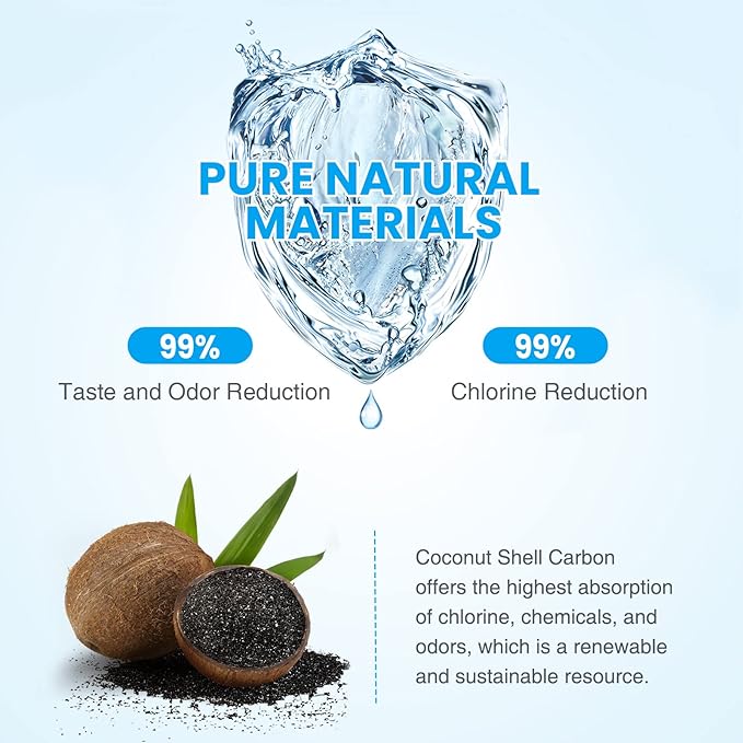 - 【Efficient Carbon Filter】-Our water filter replacement cartridge is made of 100% activated coconut shell for maximum filtration efficiency. This activated charcoal water sediment filtration filters up to 99% sand, soil, particles, sediments silt, rust, iron, sulfur, chlorine taste & odor. Removed all sediment coming from the city water, exceptional filter provides crystal-clear perfect water from whole-house water filter system.