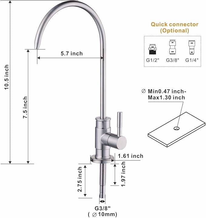 - Easy to install: This reverse osmosis faucet provides three quick connectors installation:1/4", 3/8",1/2” to meet your various installation needs. This filter faucet stem can fit Max. 1.57 inch thickness countertop, please check before buying this water faucet whether can connect to your RO unit or water filtration system or not