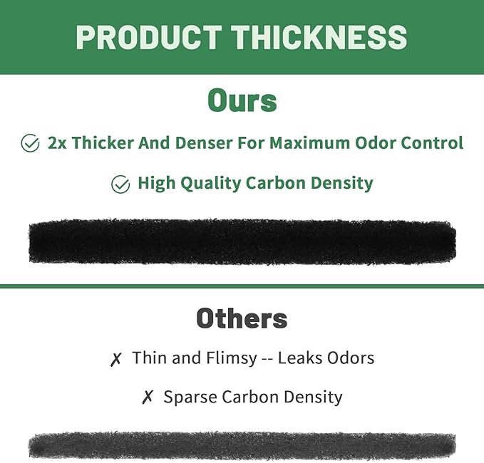 - SAFE MATERIAL: These activated carbon filters (fibrous) are made of high-quality powdered activated carbon as the adsorption material, and the high-density polymer binding material is used to attach the carbon to the fiber. With the thickness of 0.8-1cm (0.4"), the filters can efficiently absorb odors.