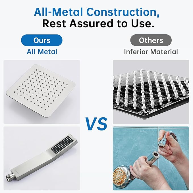 - SHOWER HEAD COMBO: 10" rainfall shower head with handheld wand. Both are metal construction that not easy to break. The top shower brings a powerful water flow to you. The handheld sprayer makes you feel a convenient shower experience