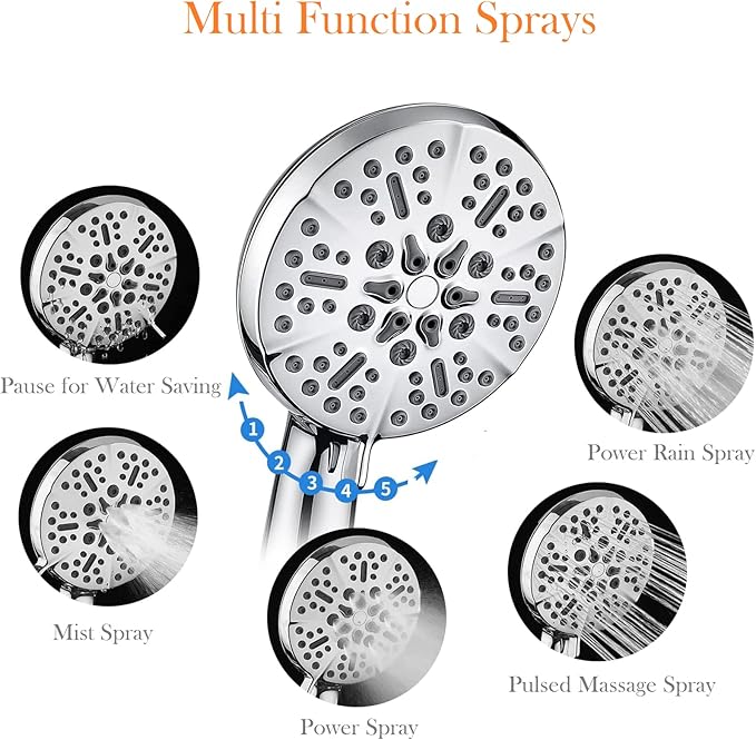 - @ Multi Function Shower Head Set - BOWGER hydro jet overall showerheads has 5 settings for choice. The PAUSE function is for water saving as well as keeps water warm during you doing shampoo, shaving etc. Power rain spray and pulsed massage spray and power mist spray will redefine your shower experience. You can use it in your house,apartment,or outdoor,camp etc. for enjoying a luxury strong SPA bath