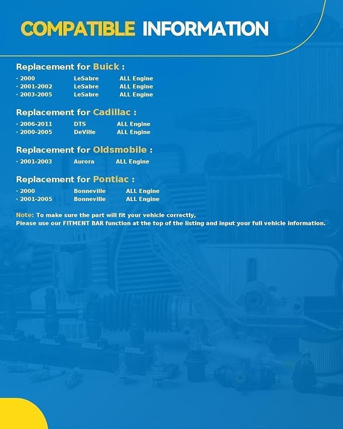 - Compatible Auto List: Replacement for Buick LeSabre 2000-2005, Cadillac DTS 2006-2011, DeVille 2000-2005, Pontiac Bonneville 2000-2005, Oldsmobile Aurora 2001-2003