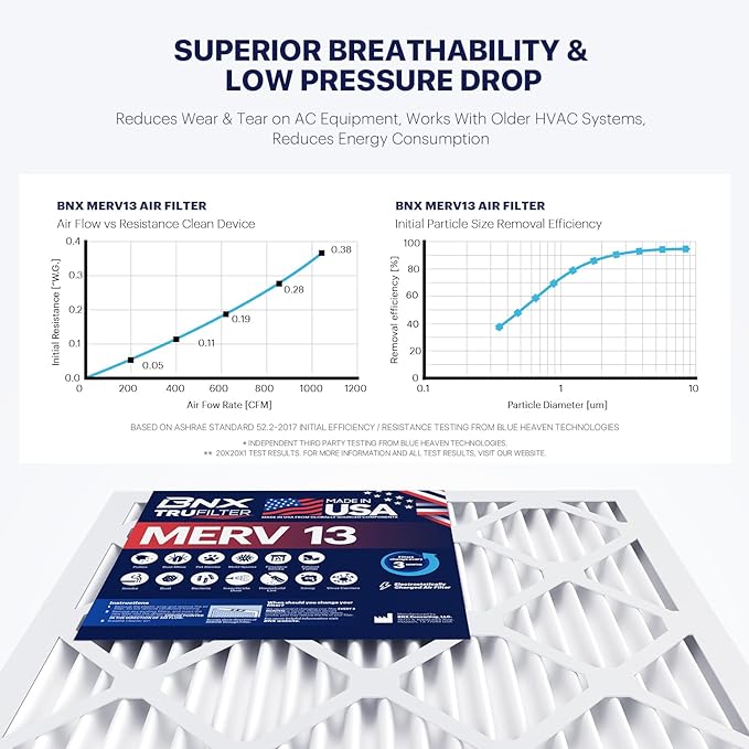- SUPERIOR PERFORMANCE - The BNX MERV 13 air filter media outperforms standard fiberglass filters and adopts the latest in electrostatic filtration technology to capture maximum pollen, mold bacteria, smoke, carriers & other microscopic particles while maintaining industry leading superior low air flow resistance.
