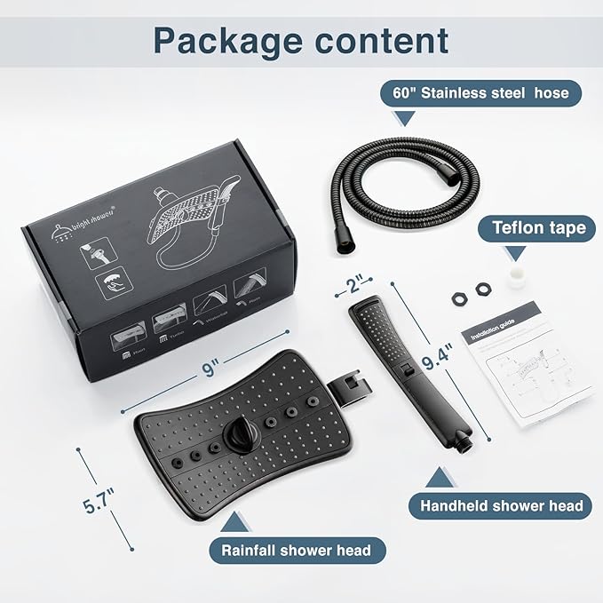 - Rain shower heads combo is packaged in a strong box, perfect as a gift to friends. Package includes: 1*Rain shower head, 1*Handheld shower, 1*60 Inches stainless steel shower hose, 1*Teflon thread seal tape. Please note washers are pre-assembled. NO shower arm included in the packaging.