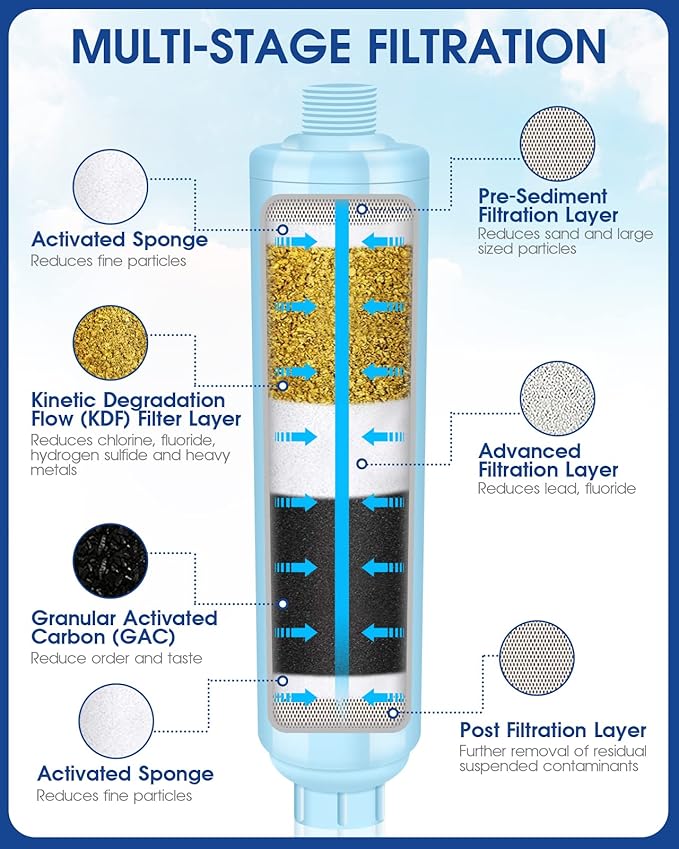 - [NSF Certified] This garden hose end pre-filter is NSF certified and uses Kinetic Degradation Fluxion (KDF) technology for efficient multi-stage filtration to ensure your experience.