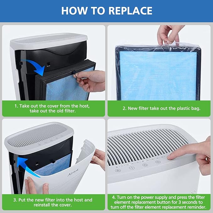 - 【EASY TO REPLACE】: Take out our AP1002 fil-ters from plastic packaging before placing them into air puri-fier. Installs simply and fits snugly. After installation, press and hold the fil-ter replacement indicator to reset the change fil-ter reminder