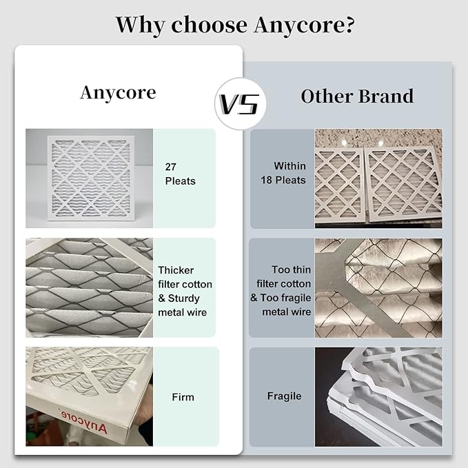 - MERV 11 Efficiency for Clean: Rated MERV 11 (Equivalent to MPR 1000/FPR 7). Anycore air filter 14x14x1 captures up to 95% of airborne particles without restricting airflow. Engineered with high-density filtration media to balance performance and system protection.