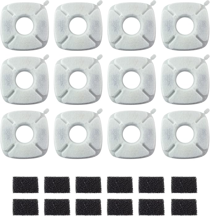 - [Premium 12 Pack Pet Fountain Filters] 12-pack of premium pet fountain replacement filters and 12 Pack of pre-filter sponges individually packaged and sealed to maintain high quality. Enough supply for 3 to 12 months of use. Replace the pre-filter sponge every 4-6 weeks.