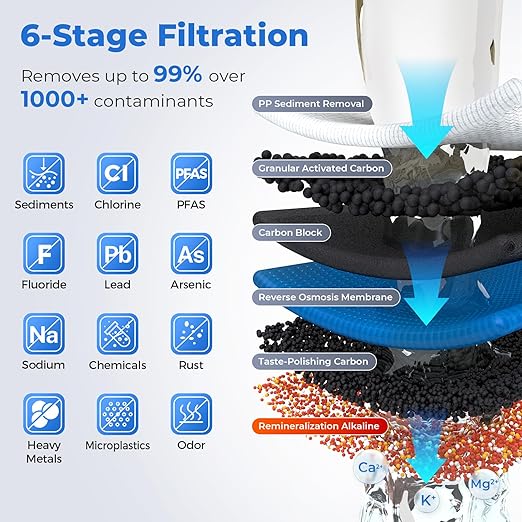 - 【Restore Balanced Alkalinity】 PureDrop RO under sink water filter system uses a 6-Stage Alkaline Remineralization Layered Filtration for superior water quality. Unlike traditional reverse osmosis systems that produce slightly acidic water, an alkaline remineralization filter - restores healthy minerals and produces a balanced alkalinity. This reliable and ultra-safe Reverse Osmosis water filter system ensures clean, pure, and healthy drinking water.