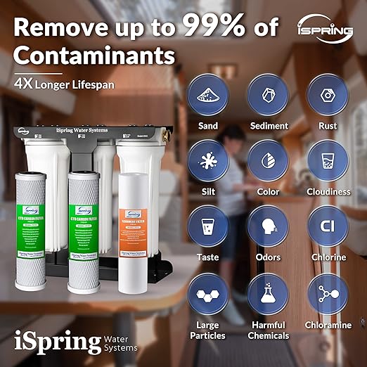 iSpring CW31 RV Water Filter System, 3-Stage RV Water Filtration System for Campers, 3/4'' Lead-Free Brass Hose Quick Connectors, Tankless, High Capacity, White