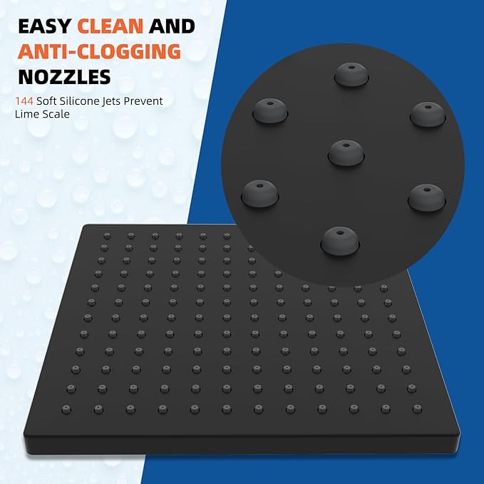 - Self-Cleaning Nozzle: The rainfall shower head consists of 144 soft silicone nozzle sprays. It prevents limescale build-up, resists clogging and is easy to clean. Free from maintenance troubles