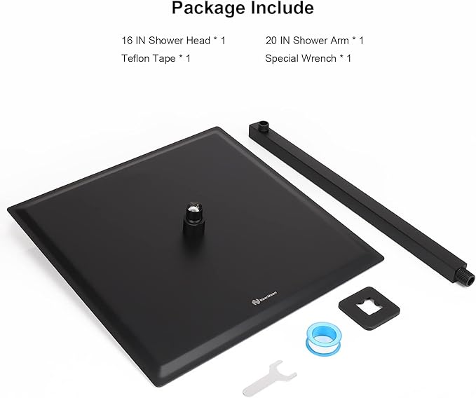 - INCLUDES: 16 inches 304 Stainless Steel Rain Shower Head and 20 Inches Solid Metal Square Shower Arm,Tefon Tape. The installation very simple to complete in 10 minutes without necessary to call a plumber.