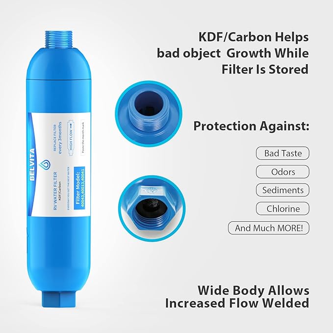 - High-quality Materials: BELVITA RV inline uses advanced Granular Activated Carbon GAC and Kinetic Degradation Fluxion (KDF), it can effectively chlorine, bad taste, odor and sediment