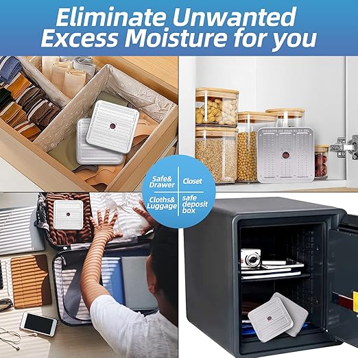- 【Versatile】: Silica gel container can Protects up to 150 cubic ft of enclosed storage space., including safes, ammo cans, toolboxes, 3D printer filament storage boxes, weapon cases, and closets. It provides an effective solution for moisture prevention in various items such as guns, important papers, legal documents, collectibles, books, jewelry, photo albums, shoes, camera lenses, valuable camera equipment, toys, leather clothing, ammunition, and photographic gear.