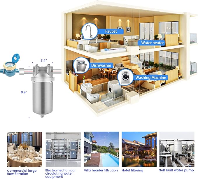 - 【Various Applications】Stainless steel filter housings are suitable for water filtration throughout the house, at the kitchen sink or for commercial use, including residential drinking water filtration, food service and humidification systems.