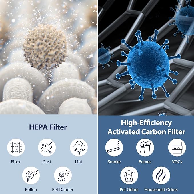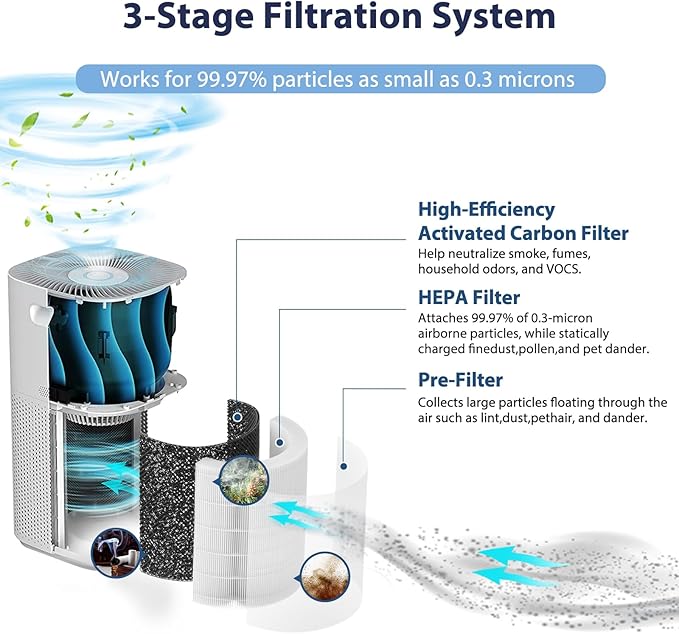 - 【3-STAGES FILTRATION SYSTEM】Our Core 600S air filter is made of 3-in-1 HEPA high filtration efficiency material, which effectively resists 99.97% of airborne particles as small as 0.3 microns in the air. This new material design helps to maximize the filter’s life.