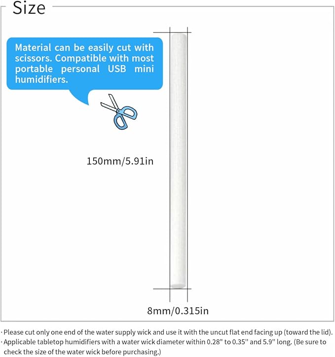 - [Size] 5.9 inch long x 0.32 inch diameter (for water wick diameter within 0.28 inch to 0.35 inch, 5.9 inch long tabletop humidifier) * Be sure to confirm the size of the water wick before purchase.