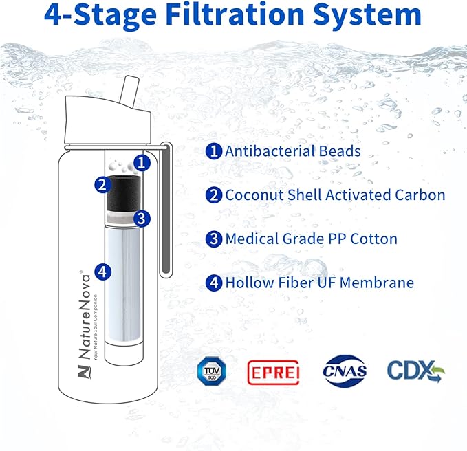 - 【Advanced 4-level Water Filter Bottle】: Water filter bottle have 4-stage integrated filter straw,adopt Medical Grade Hollow Fiber UF Membrane, Coconut Shell Activated Carbon, Antibacteiral Beads, Medical grade PP cotton, The filtration accuracy is 0.01 microns could effectively filter impurities in water.