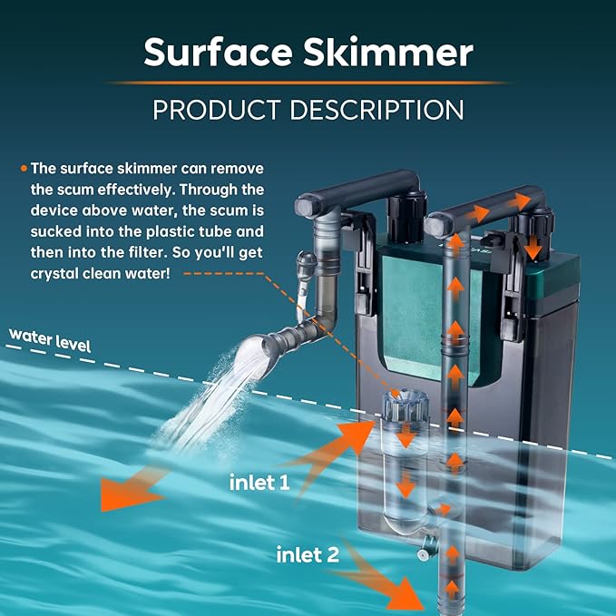 - ⭐【UNIQUE DESIGN】We have optimized the structure of the motor. Through technical improvement, you can unplug the power at any time. As long as you need it, the water level in the filter tank will not drop because of this. After completing the work you need, plug in the power and the filter will run.Enjoy your "Plug&Play".The designed water flow will disperse at the bottom of the filter barrel, reduce the accumulation, enhance the filtering effect and filter cotton life.
