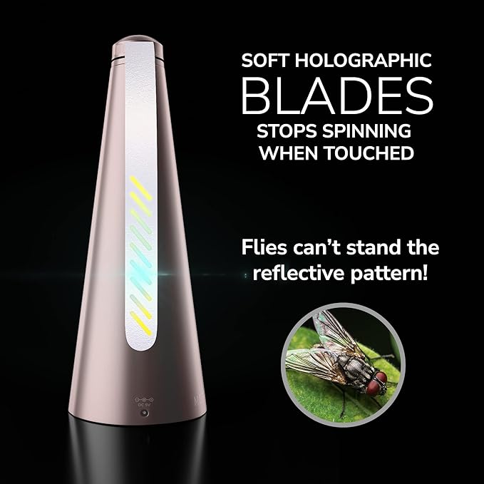 - ✅ Soft, Long Holographic Blades - The reflective pattern on this table fly fan effectively keeps bugs away. Touch the blades anytime to stop them; they will simply restart upon release. It’s a modern natural fly swatter for outdoor dining.