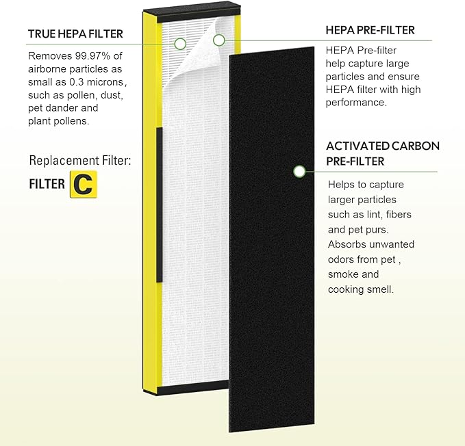 - H13 True HEPA: HEPA filters are made of H13 grade ture HEPA filter media, which can helps capture small particles as small as 0.3 mirons.