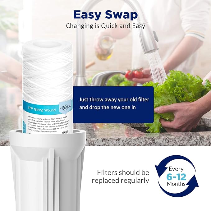- MULTIPLE ADVANTAGES: This String-wound sediment water filter has FOUR times the dirt holding capacity and DOUBLE the flow rate of PP sediment filter, allowing for longer service life. It's the ideal solution if your feed-water is of low quality and contains a lot of sediment.