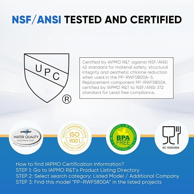 - ❄️Authoritative Certifications - The filter is certified by NSF/ANSI 42 for reducing chlorine, taste, and odor, and NSF/ANSI/CAN 372 for lead-free compliance. It removes 99% of chlorine, enhancing water taste. It is also certified by Canadian CSA, BPA Free, and Australian Water Mark. Only select products with authoritative certifications for your households.