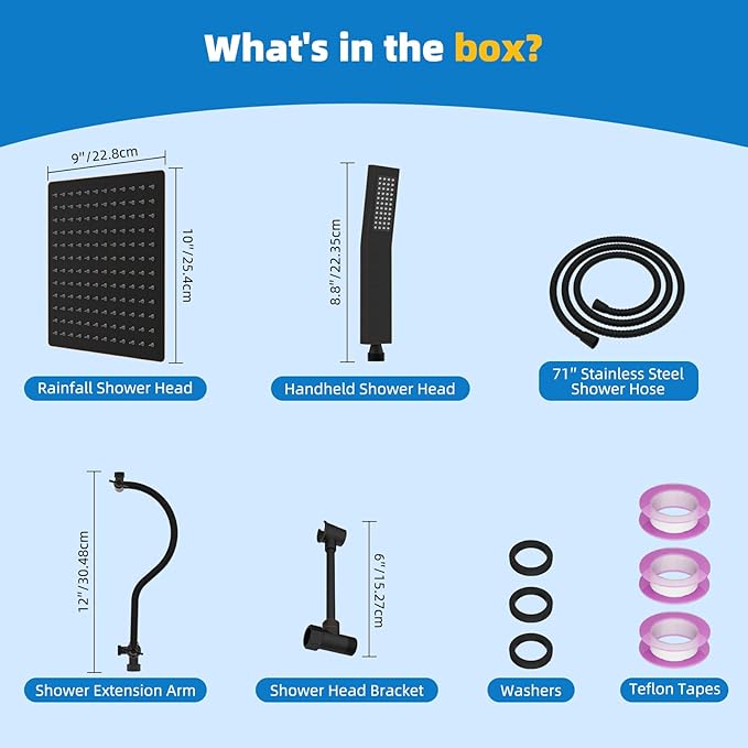 - Shower Head Combo: Hibbent shower combination comes with a 10x9'' rain shower head, handheld shower head, 71'' hose, 12'' extension arm, shower head bracket, washers, Teflon tape, and installation manual. The extra-long 71'' shower hose is made of odorless EPDM, stainless steel and brass material that can be used in a high-temperature environment. The brass swivel ball connector makes it easy to adjust the shower head to any angle you want, giving you a luxurious, hotel-style bathing experience