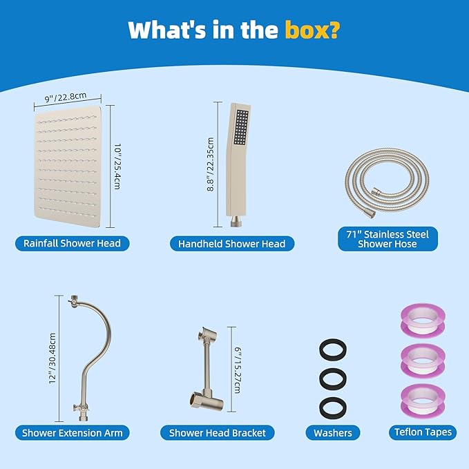 - Shower Head Combo: Hibbent shower combination comes with a 10x9'' rain shower head, handheld shower head, 71'' hose, 12'' extension arm, shower head bracket, washers, Teflon tape, and installation manual. Stainless steel and brass extra-long 71'' shower hose is made of odorless EPDM material that can be used in a high-temperature environment. The brass swivel ball connector makes it easy to adjust the shower head to any angle you want, giving you a luxurious, hotel-style bathing experience
