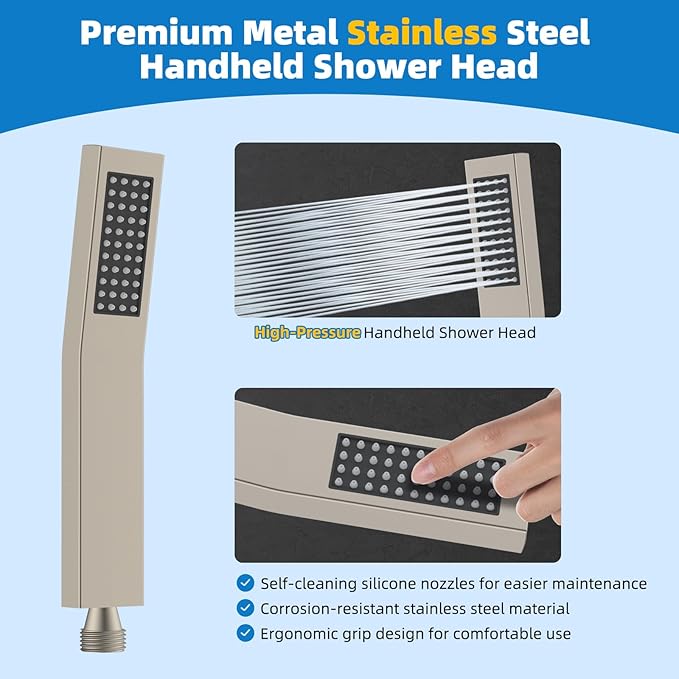 - Metal Shower Head Bracket & Shower Wand: Compared to a typical shower head bracket, the Hibbent bracket is longer and prevents the handheld spray from hitting the back of the rain shower head. Other shower heads come with shorter brackets, causing the handheld spray to hit the back of the rain shower head. The shower head and bracket are made of stainless steel and brass, ensuring long-lasting corrosion resistance. The shower head holder perfectly adjusts the angle of your shower head