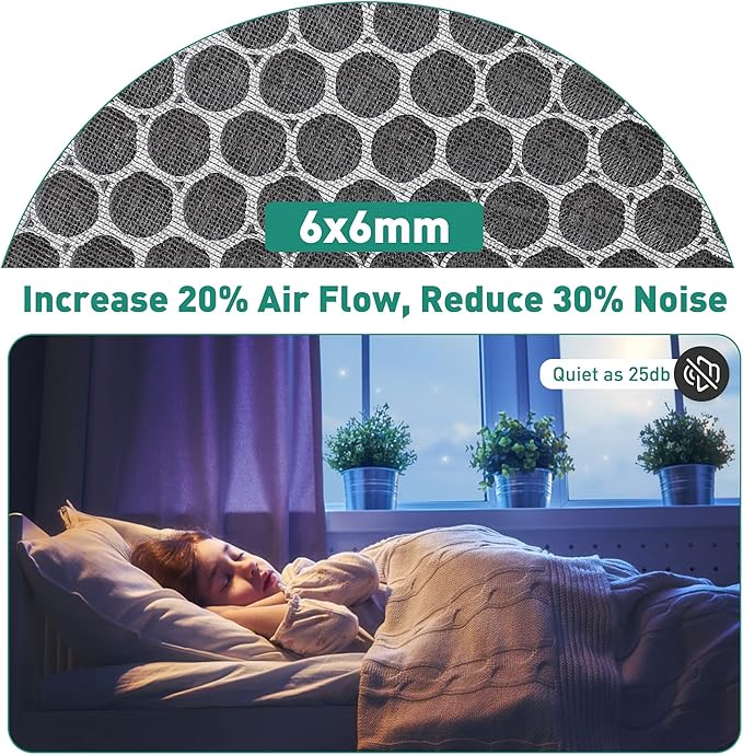 - True H13 HEPA Filtration - ①Nylon Preliminary Filter traps hair, pet fur, and lint etc. ②H13 Grade True HEPA Filter captures 99.97% of suspended down to 0.25 microns in size ③Activated Carbon Filter absorbs household odors from pets, cooking, smoking and wildfire.