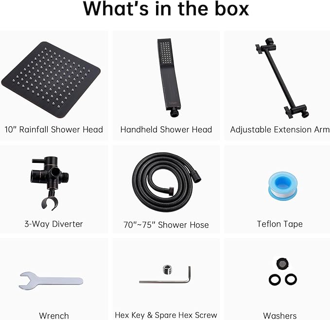 - ►PACKAGE INCLUDES: Rainfall shower head, handheld shower head, shower extension arm, shower hose, shower diverter and accessories