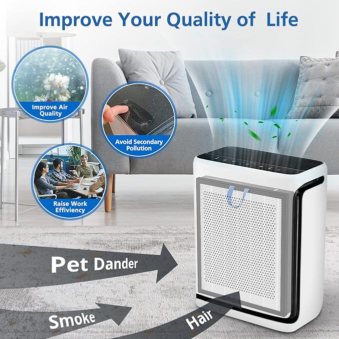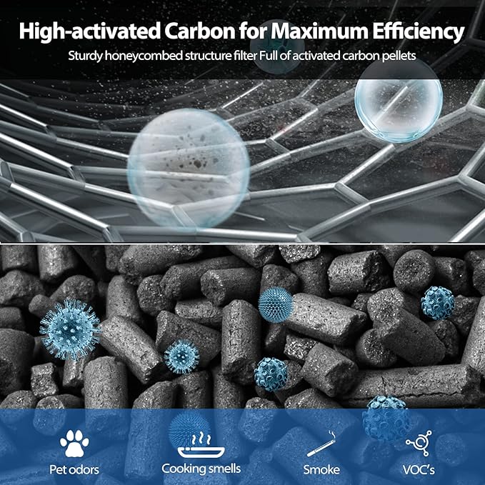 - Filter Out Unpleasant Odors: High-grade vital 200s activated carbon filter layer improves deodorant ability by 60%, helps reduce unpleasant odors and fumes such as smoke, cooking odors, and pet odors, as well as VOCs, which makes it a good choice for homes with pets, cooking, and smokers. Reduce all odors and gases from your home to improve the air quality and your health without worrying about second-hand pollution