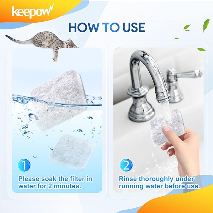 - NOTE: To prevent activated carbon dust (which will not harm your pet) from being shed into the water, soak the filter in water for 2 minutes and rinse the filter for cat water fountain thoroughly under running water before use