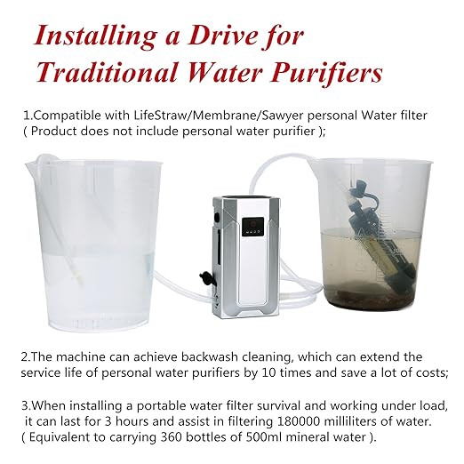 - When installing a portable water filter survival and working under load, it can last for 3 hours and assist in filtering 180000 milliliters of water (equivalent to carrying 360 bottles of 500ml mineral water).【 It is prohibited to directly pump sewage, as debris may damage the water pump.】