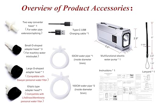 - The gross weight of the water pump is only 246g (5.5*1.5*3in), making it easy to carry. Compatible with portable sawyer mini water filter. We pass CE FCC ROHS IPX3 & Standardization ISO 9001. Also, provide unconditional free return service within 60 days, please rest assured to buy products. Brand: NNOOAADIO.