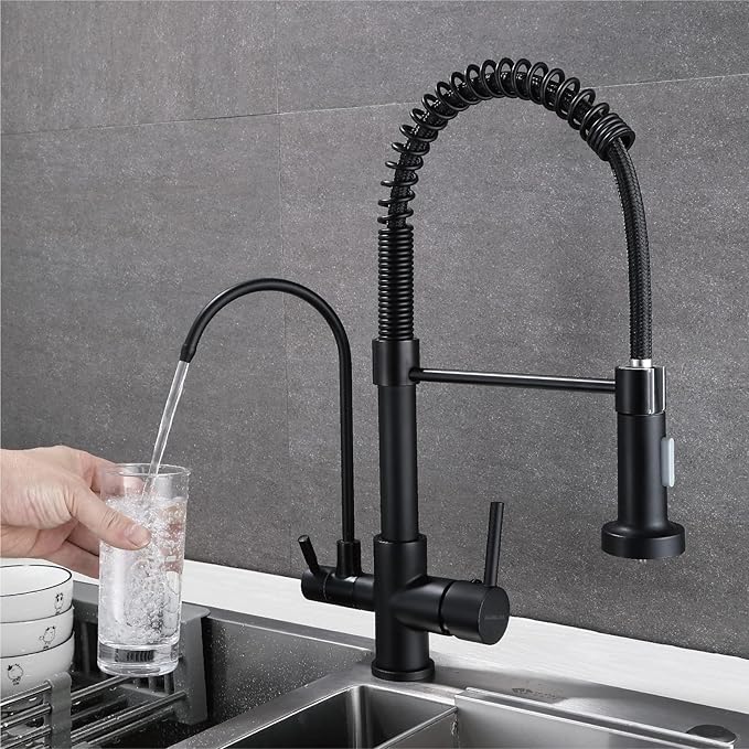 - 【Modern Matte Black Design】Upgrade your kitchen with this commercial-grade faucet for kitchen sink! The industrial matte black finish resists fingerprints and stains, while the high-arc spout fits most sinks. Ideal as a water filter for sink faucet or tap water filter solution.