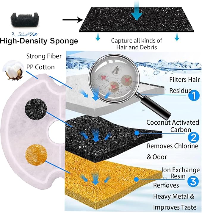 - Materials:Each cat fountain filter is composed of activated carbon, ion exchange resin and non-woven fabric. Non-Woven Fabric:Filter hair,debris & sediment. Coconut Shell Activated Carbon:Absorb impurities & odor. Ion Exchange Resin:Soften water & reduce heavy metals.They could make water more suitable for pet.