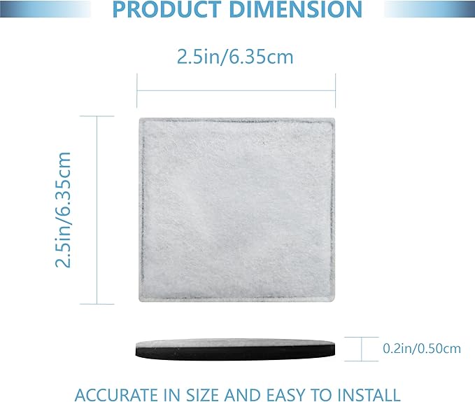 - High Compatibility: Pack of 12; Diameter: 2.5" x 2.5" x 0.2". Compatible with PetSafe Aqua Fountain Aqua Cube, Aqua Fountain Aqua Falls, Current Pet Water Fountain, and Catit Square Mini Flower Pet Water Fountain. The cat water fountain filter replacement is precise in size and easy to install