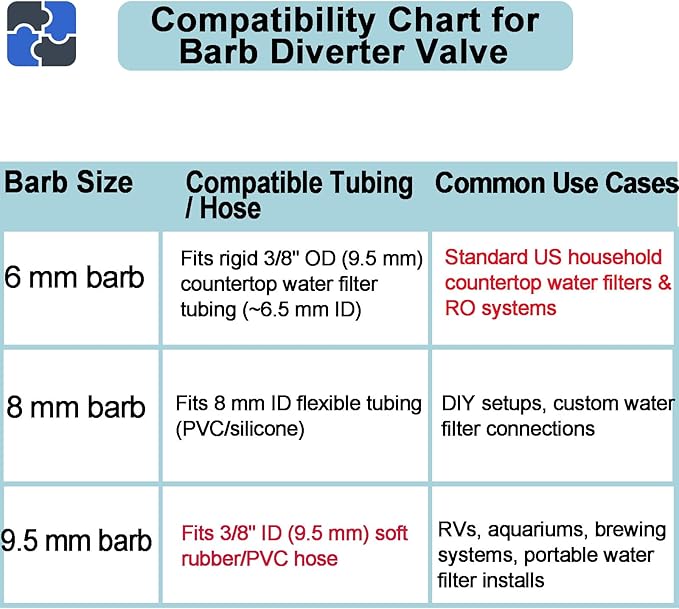 - 【6 mm Barb – For 3/8" OD Tubing】 Ideal for most US household countertop water filter tubing (3/8" outer diameter, ~6.5 mm inner diameter). Provides a snug leak-free fit.