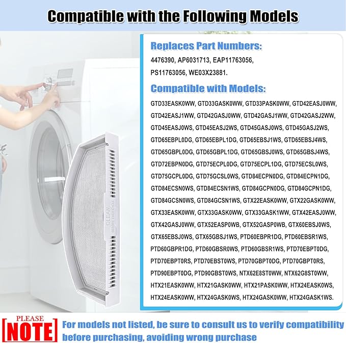 - COMPATIBILITY: The WE03X23881 Lint Filter is only fit for some specific dryer models. Replaces part Numbers 4476390, AP6031713, EAP11763056, PS11763056. ( It is not universal, please check the compatibility before purchasing.)