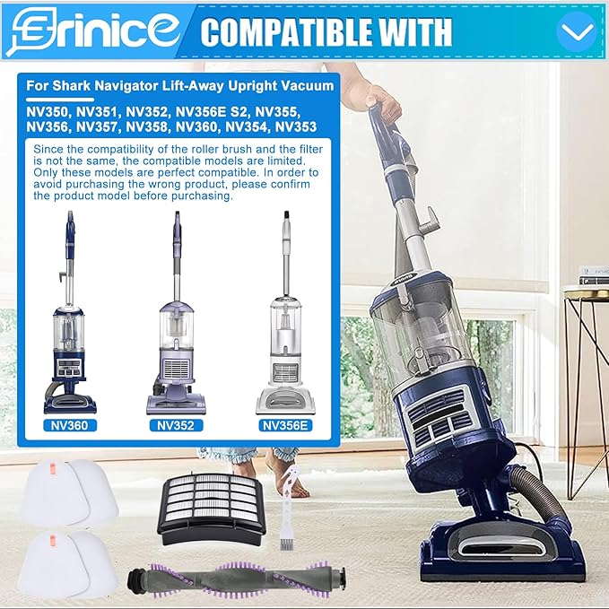 - 【Wide Compatibility】-- Erinice Replacement Brush Roller Filter Kit is perfect compatible with Shark Navigator Lift Away Vacuum NV350, NV351, NV352, NV356E S2, NV355, NV356, NV357, NV358, NV360, NV354, NV353, UV440, Compare to Part XFF350 & XHF350. (Since the difference of black HEPA filter, so this set only compatible with these models) (Please check the model of your vacuum machine before purchase, to avoid mistake order!)