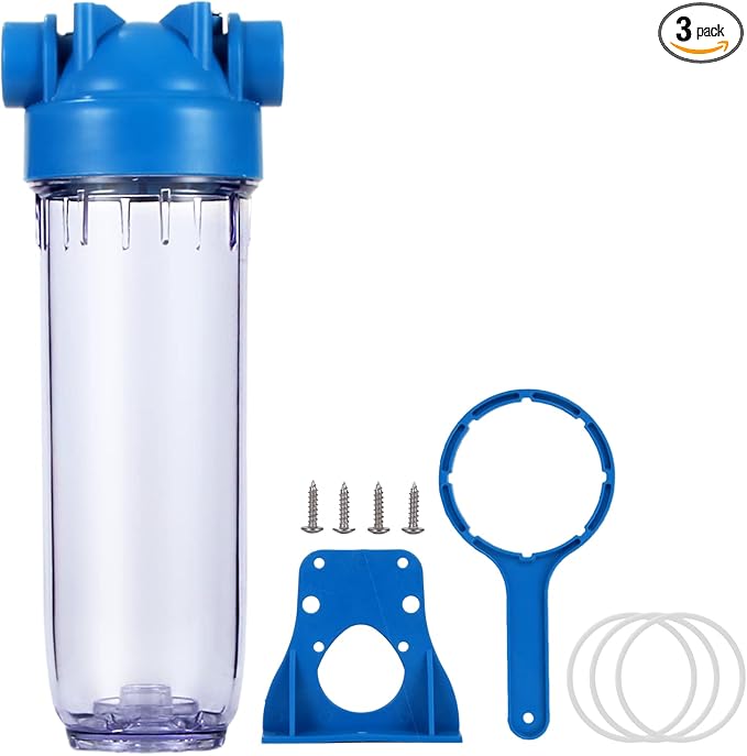 - 10 Inch whole house clear water filter housing,3/4 inch brass ports with pressure relief button for high pressure,with plastic wrench and bracket.clear housing allows you to see when you need to change filters and everything else works as it should