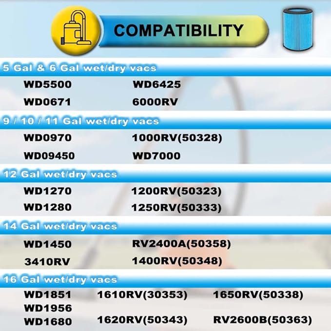 - COMPATIBILITY: Compatible with RIDGID vacs 5 gal. or larger, models # 5 Gallon: WD5500. // 6 Gallon: WD0671, WD6425, 6000RV(50308). // 9 Gallon: WD0970, WD09450. // 10 Gallon: 1000RV(50328). // 11 Gallon: WD7000. // 12 Gallon: WD1270, WD1280, 1200RV(50323), 1250RV(50333). // 14 Gallon: WD1450, 3410RV, RV2400A(50358), 1400RV(50348). // 16 Gallon: WD1851, WD1680, WD1956, RV2600B(50363), 1650RV(50338), 1620RV(50343), 1610RV(50353).