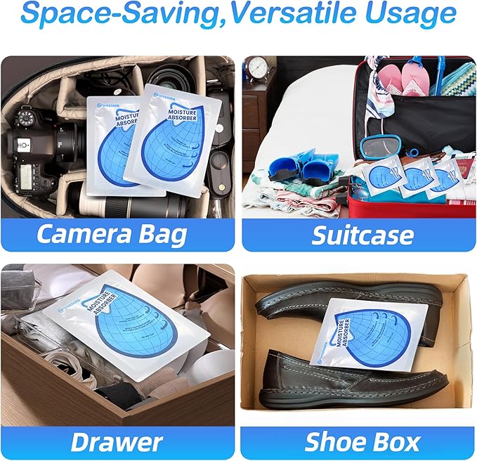 - 【Versatile Usage】: Moisture absorber packets can be used in various locations, including closets, wardrobes, basements, laundry rooms, households, bathrooms, kitchens, shoe cabinets, cars, cat litter boxes, toolboxes, RVs, campers, and other enclosed spaces. These moisture absorber bags effectively protect your valuables from damage caused by excess moisture and prevent smells. Remember to keep the paper side facing up for optimal performance.