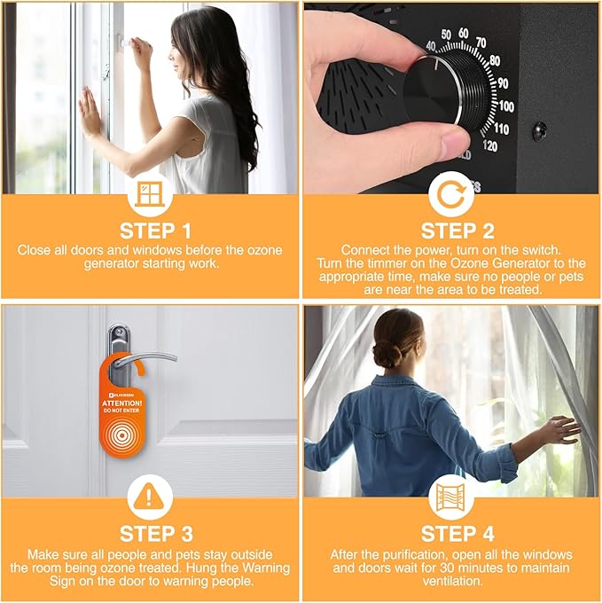 - Attention: This ozone generator is designed for use in unoccupied spaces only. When the machine is operating, ensure all doors and windows are closed, and all people and pets have left the room. After the ozone generator stops working, ventilate the room for at least 30 minutes and ensure there is no ozone odor before re-entering.